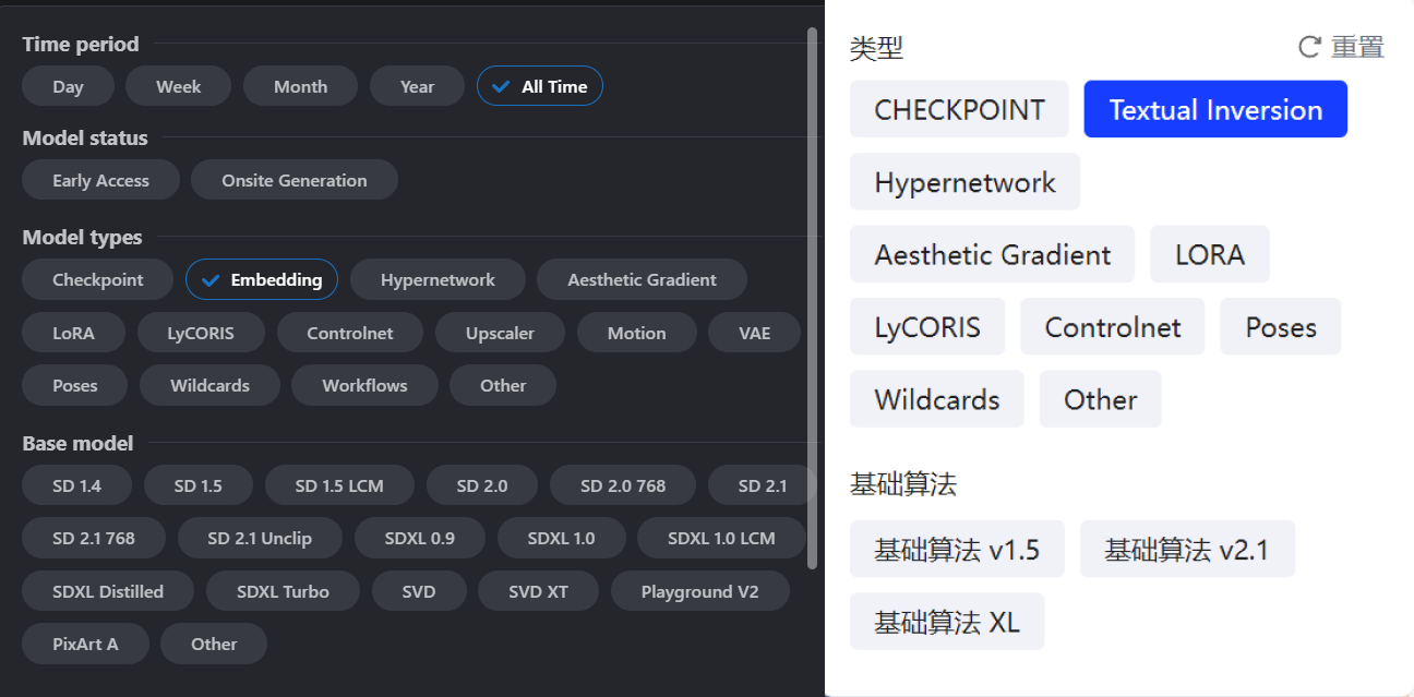 - 我们在部份模型下载网站很有可能看不到 Embeddings 模型,但是他会以 Textual Inversion(文本倒置)这个名字出现,他们是同一个东西(下图是 C 站和 LibLib 的筛选框)。