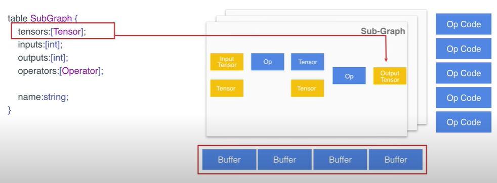 - Sub-Graph 是Model 里的重要的结构体, 它定义了图的具体结构,其中 Sub-Graph 下的 tensors 它是定义了子图中的各个tensor;