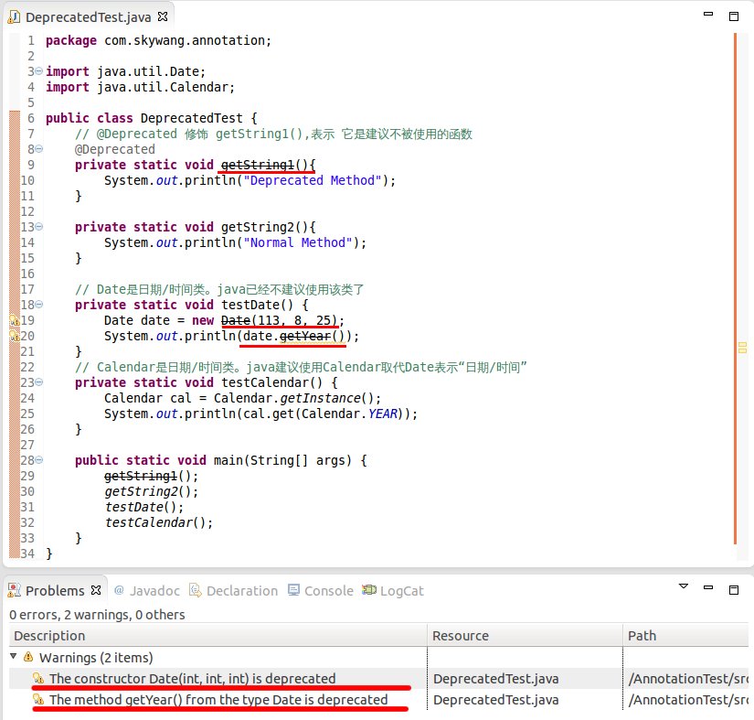 Date 属于 java 不再建议使用的类。因此,调用 Date 的 API 时,会产生警告。使用了 @SuppressWarnings(value={“deprecation”})后,可以看到编译器对”调用 Date 的 API 产生的警告”保持沉默,黄色警告线消失