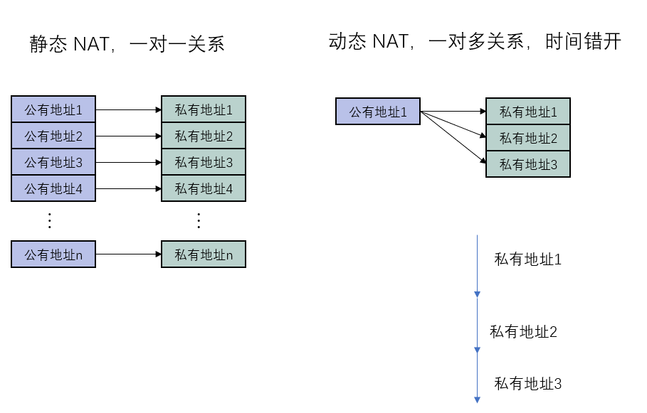- 动态 NAT 是公网 IP 地址和私有 IP 地址有一对多的关系,同一个公网 IP 地址分配给不同的私网用户使用,使用时间必须错开。它包含一个公有 IP 地址池和一张动态地址映射表。