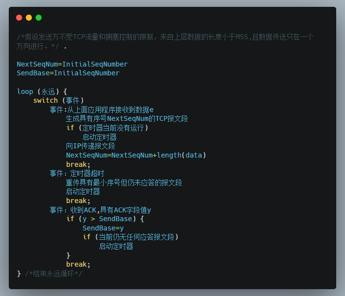 // 假设发送方不受TCP流量和拥塞控制的限制,来自上层数据的长度小于MSS,// 且数据传送只在一个方向进行NextSeqNum = InitialSeqNumberSendBase = InitialSeqNumberloop (永远) {switch (事件)事件1: 从上面应用程序接收到数据e {生成具有序号NextSeqNum的TCP报文段if (定时器当前没有运行)启动定时器向IP传递报文段NextSeqNum = NextSeqNum+length(data)}事件2: 定时器超时 {重传具有最小序号但仍未答应的报文段启动定时器break;}事件3: 收到ACK,具有ACK字段值y {if (y > SendBase) {SendBase=yif (当前仍未任何答应报文段)启动定时器}break;}} // 结束永远循环