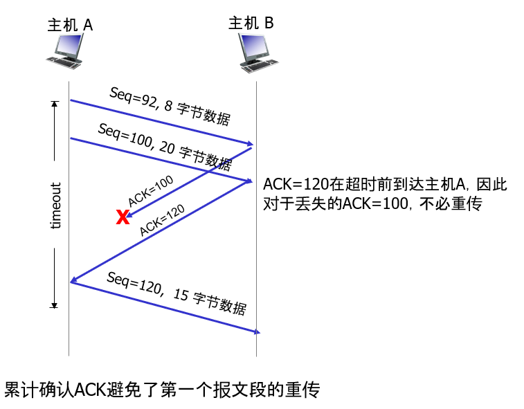在第三种也是最后一种情况,假设主机 A 与在第二种情况中完全一样,发送两个报文段。第一个报文段的确认报文在网络丢失,但在超时事件发生之前主机 A 收到一个确认号为 120 的确认报文。主机 A 因而知道主机 B 已经收到了序号为 119 及之前的所有字节;所以主机 A 不会重传这两个报文段中的任何一个。