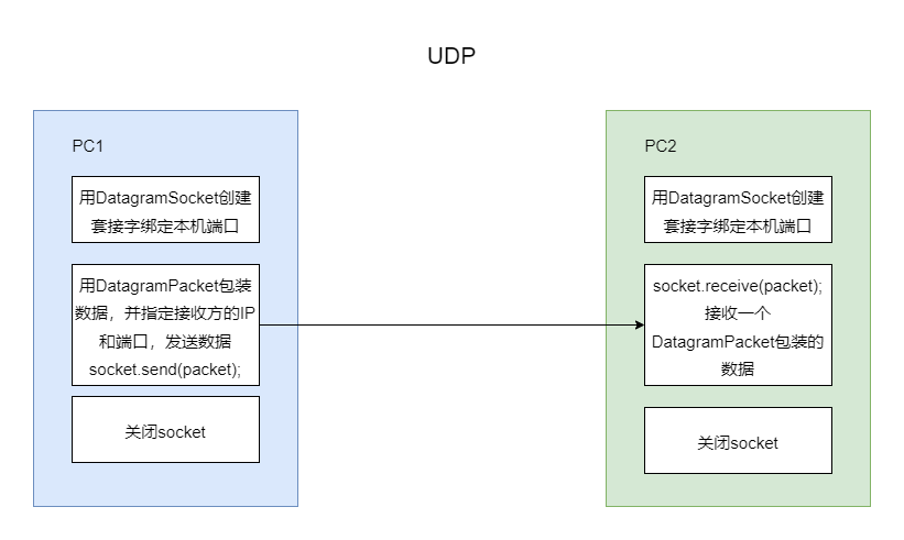 - 发送数据时先创建套接字绑定本机一个端口,向目的IP和端口发送数据,不需要去管是否有主机在这个端口接收数据