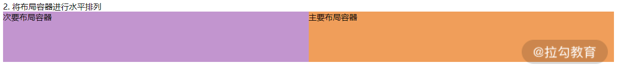 2 列布局使用频率也非常的高,实现效果就是将页面分割成左右宽度不等的两列,宽度较小的列设置为固定宽度,剩余宽度由另一列撑满。为了描述方便,我们暂且称宽度较小的列父元素为次要布局容器,宽度较大的列父元素为主要布局容器。