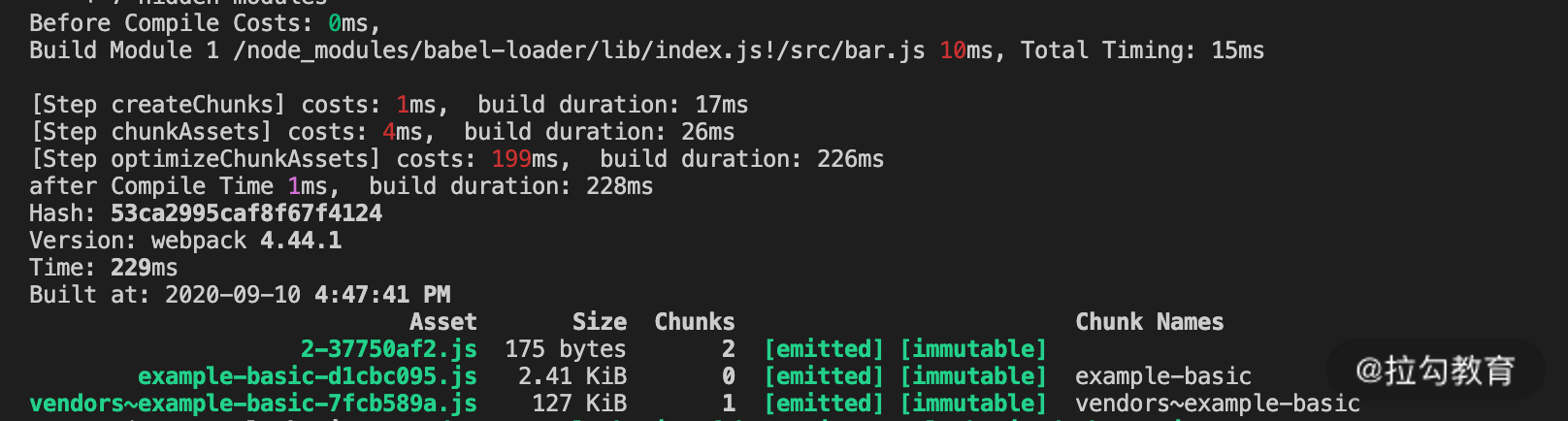体积最大的 react、react-dom 等模块和入口模块打入了同一个 Chunk 中,即使修改的模块是单独分离的 bar.js,但它的产物名称的变化仍然需要反映在入口 Chunk 的 runtime 模块中。因此入口 Chunk 也需要跟着重新压缩而无法复用压缩缓存数据。根据前面几节课的知识点,我们对配置再做一些优化,将 vendor 分离后再来看看效果,如下面的图片所示: