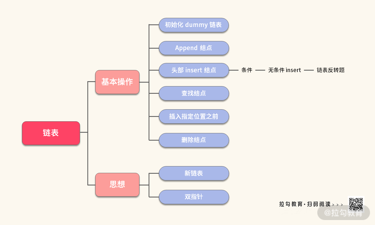 【小结】我们将这道题的考点层层剥离之后,就只剩下生成 dummy 新链表,尾巴追加新结点,以及新链表的思路。关于解决这道这类题目的思路、重点以及分析方法,建议你先尝试自己梳理总结,再来看我给出的思维导图: