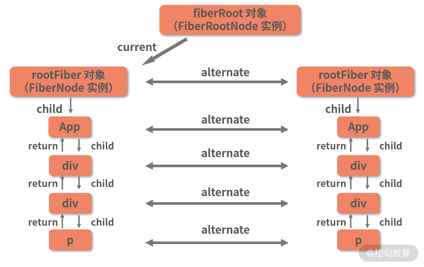 以上便是 current 树和 work 树相互 “打配合”,实现节点复用的过程。