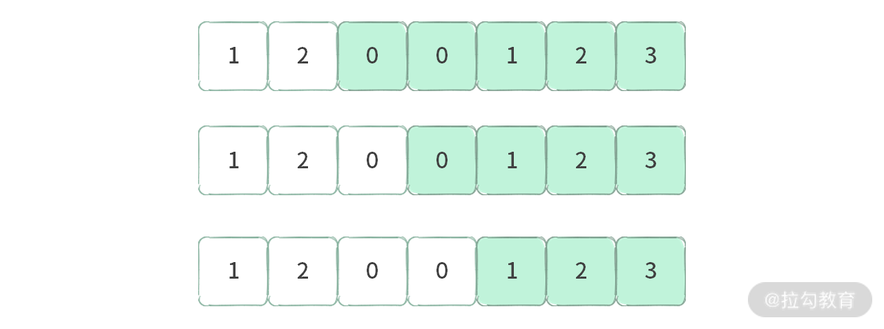 比如我们仍然以数组 [1, 2, 0, 0, 1, 2, 3] 寻找等于 6 的最短子串为例,如下图所示: