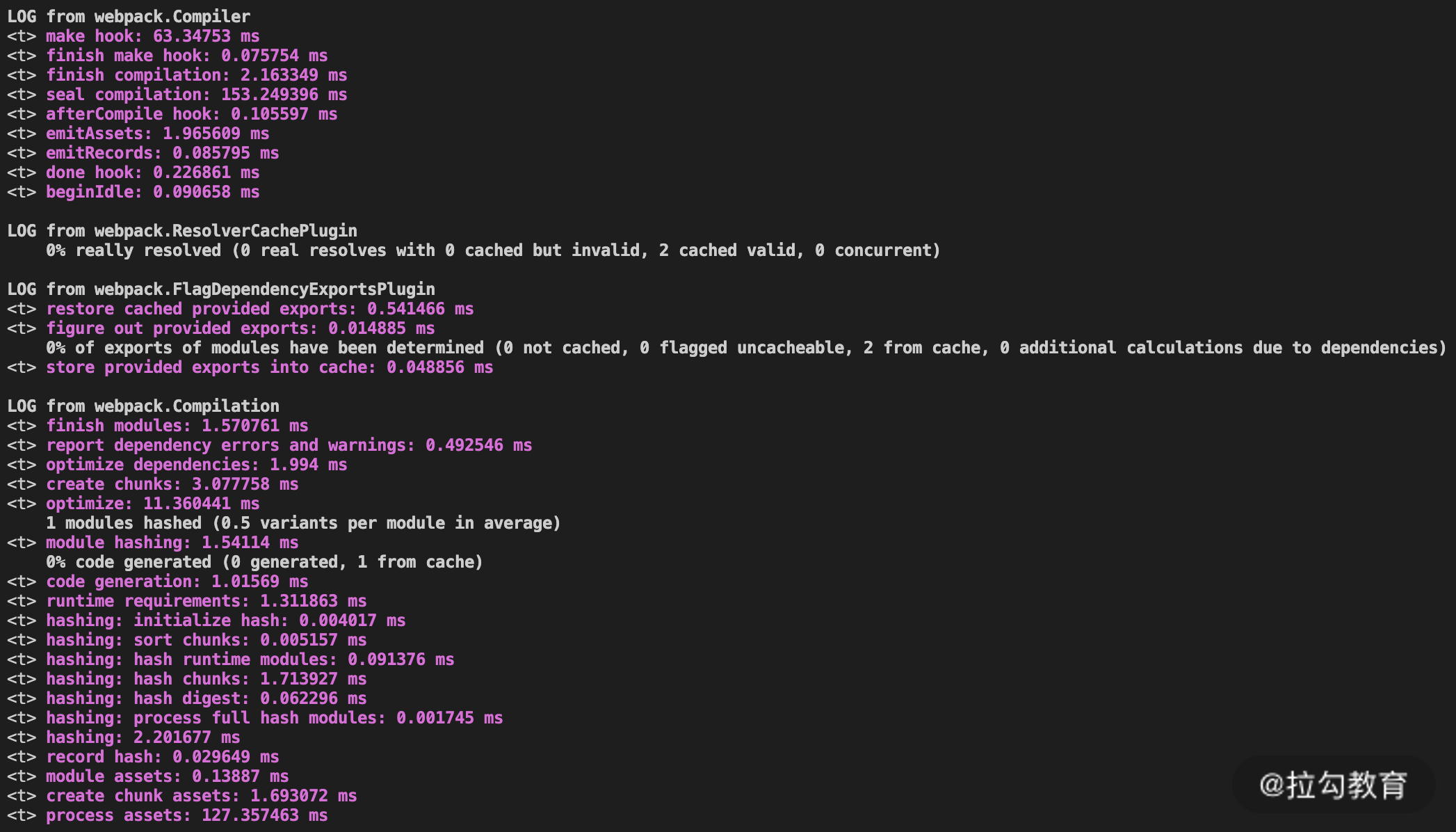 可以看到,Webpack 5 构建输出的日志要丰富完整得多。通过这些日志能够很好地反映构建各阶段的处理过程、耗费时间,以及缓存使用的情况。在大多数情况下,它已经能够代替之前人工编写的统计插件功能了。