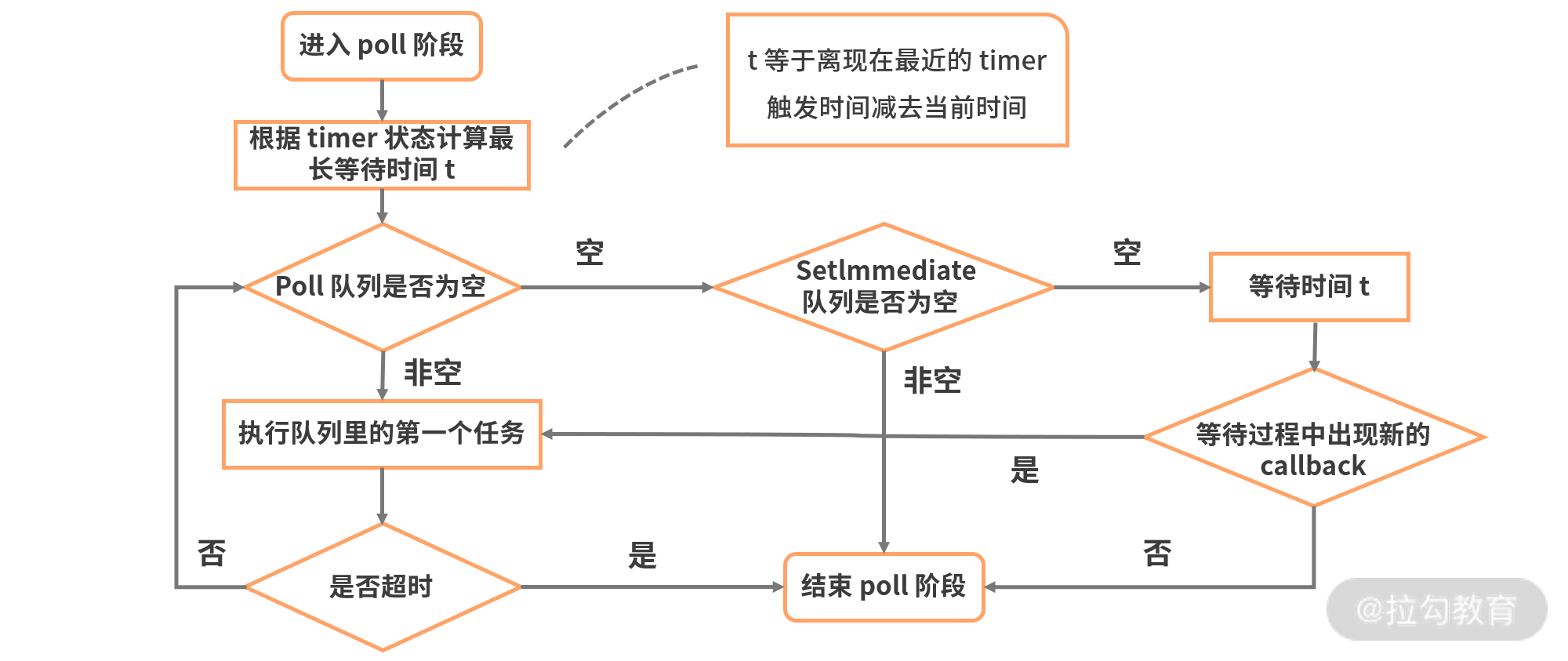 - poll 阶段:poll 阶段是一个重要且复杂的阶段,几乎所有 I/O 相关的回调,都在这个阶段执行(除了 setTimeout、setInterval、setImmediate 以及一些因为 exception 意外关闭产生的回调),这个阶段的主要流程如下图所示。