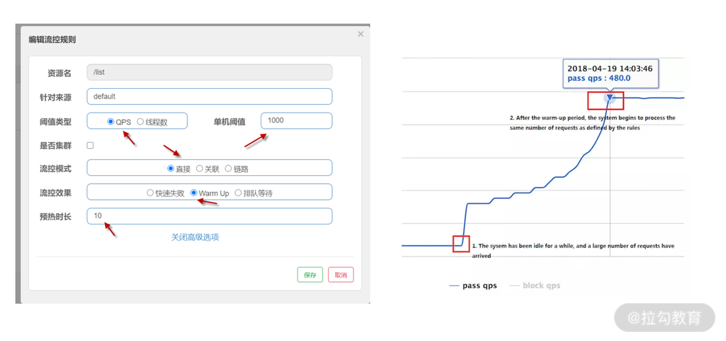 如下图所示,List 接口平时单机阈值 QPS 处于低水位:默认为 1000/3 (冷加载因子)≈333,当瞬时大流量进来,10 秒钟内将 QPS 阈值逐渐拉升至 1000,为系统留出缓冲时间,预防突发性系统崩溃。