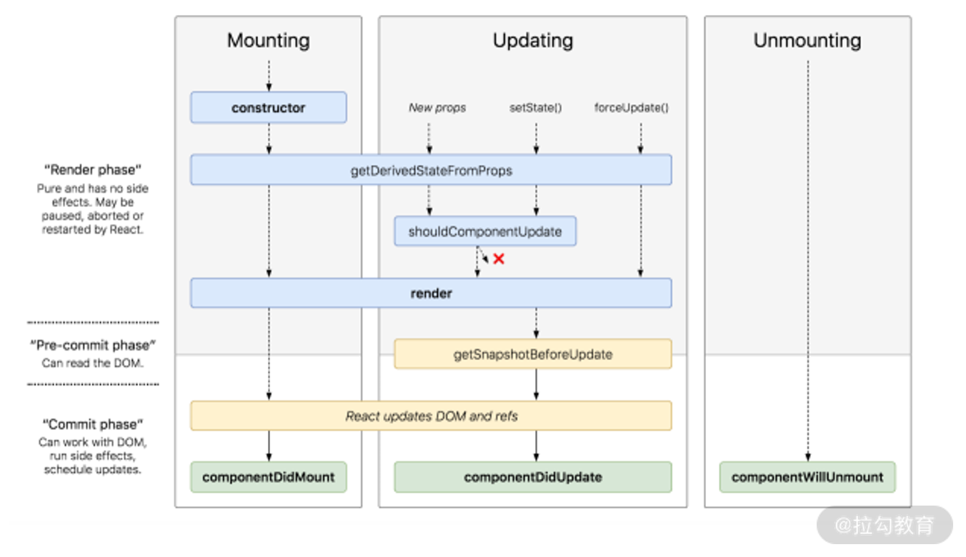 在基础篇我们曾经探讨过,React 16 的生命周期分为这样三个阶段,如下图所示: