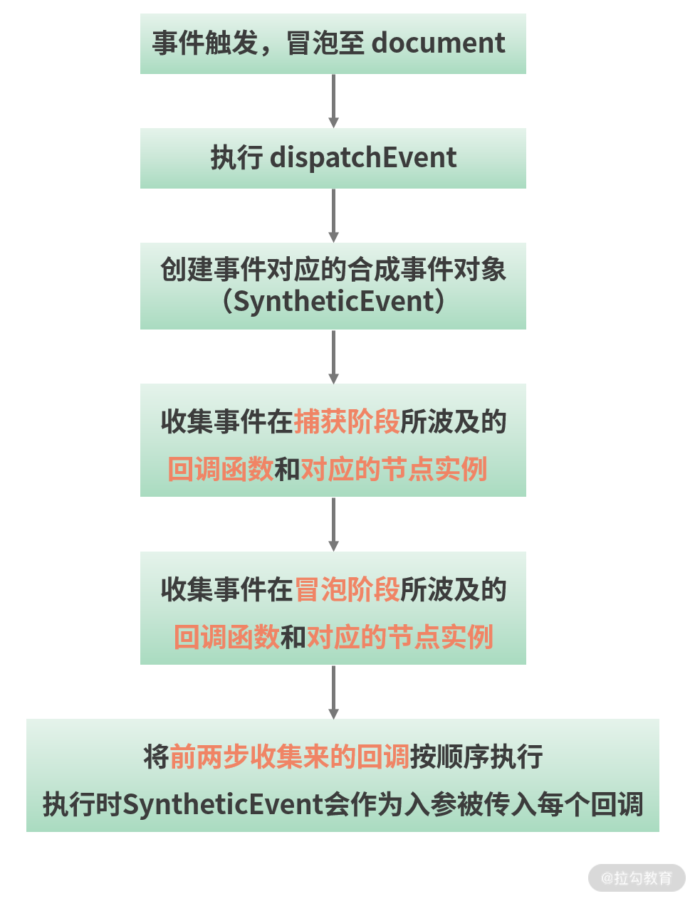这样一来,我们在事件回调的执行阶段,只需要按照顺序执行 SyntheticEvent._dispatchListeners 数组中的回调函数,就能够一口气模拟出整个完整的 DOM 事件流,也就是 “捕获 - 目标 - 冒泡” 这三个阶段。
