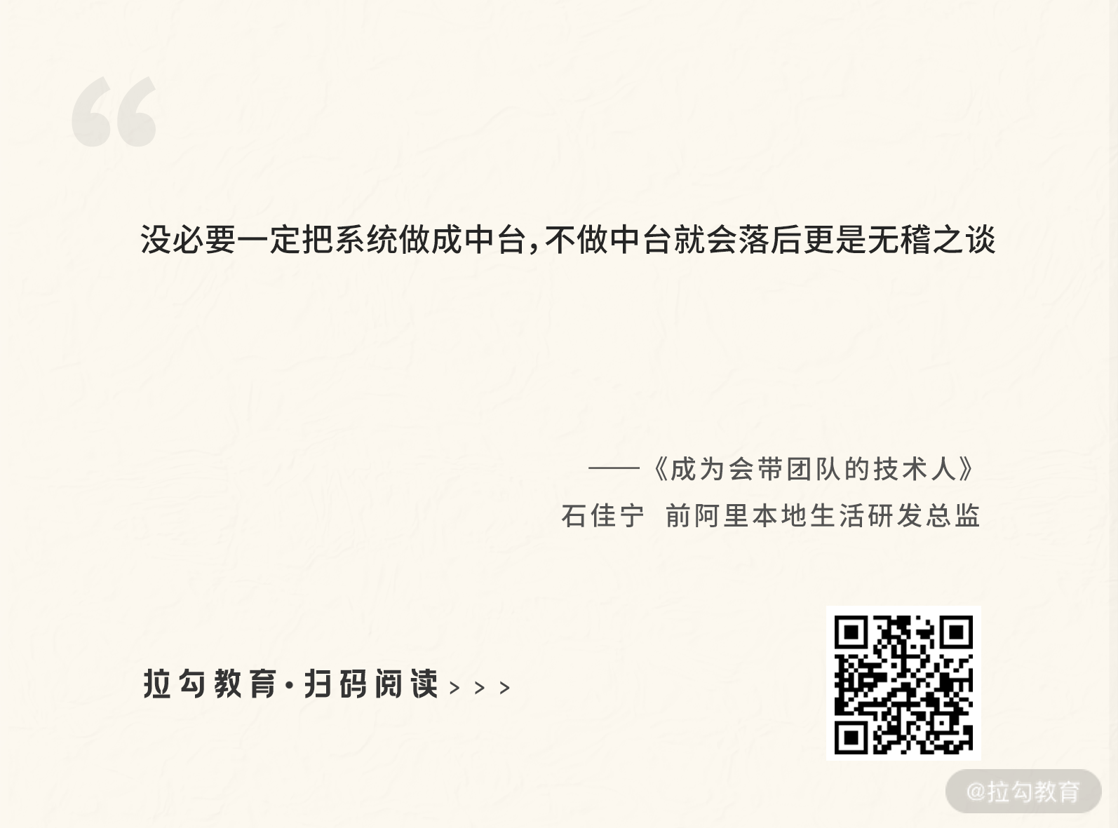 于你而言未必公司从上至下定一个叫 “中台” 的战略之后,再大刀阔斧地去做中台,完全可以先从一个很小的系统下手。另外,不要借着做中台的契机,不管什么业务、什么系统都往所谓的中台里合并,如果一个中台系统又大、又厚重、响应又慢,我真的找不出它有什么存在的价值。想清楚你要的是什么效果,如果你追求的是一个足够灵活的系统,叫不叫中台又有什么关系?
