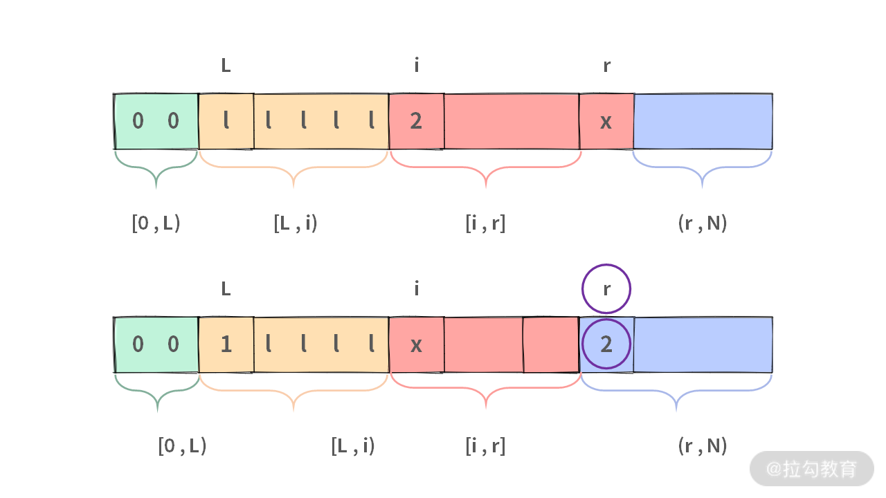 - [i, N) 等于 2 的区间。注意此时由于 i > r,实际上 i = r + 1,那么区间 (r, N) 就是 [i, N)。