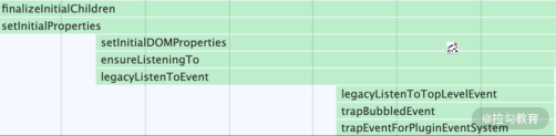 其中 “为 DOM 节点设置属性”这个环节,会遍历 FiberNode 的 props key。当遍历到事件相关的 props 时,就会触发事件的注册链路。整个过程涉及的函数调用栈如下图所示: