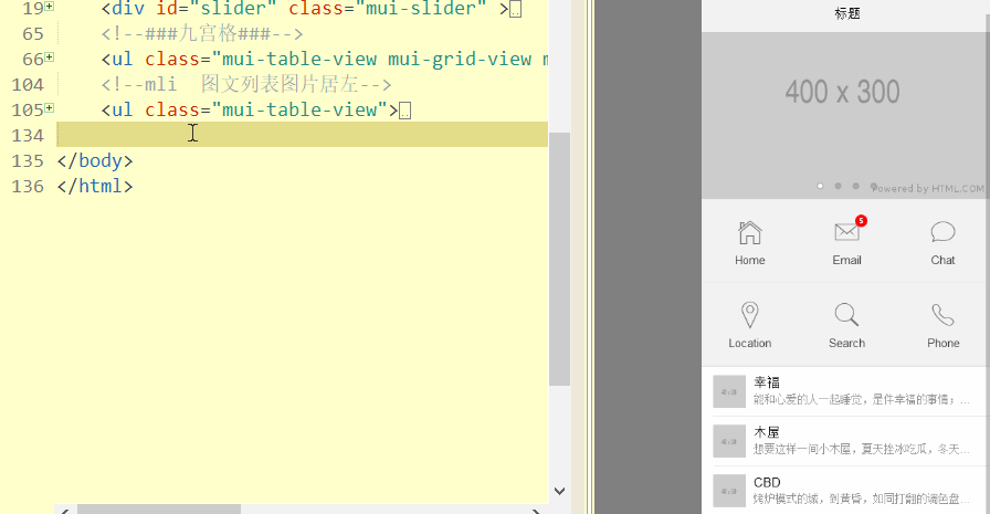 <!DOCTYPE html><html><head><meta charset="utf-8"><meta name="viewport" content="width=device-width,initial-scale=1,minimum-scale=1,maximum-scale=1,user-scalable=no" /><title></title><script src="js/mui.min.js"></script><link href="css/mui.min.css" rel="stylesheet"/><script type="text/javascript" charset="utf-8">mui.init();</script></head><body><!--###标题栏###--><header class="mui-bar mui-bar-nav"><h1 class="mui-title">首页</h1></header><!--###图片轮播###--><div id="slider" class="mui-slider" ><div class="mui-slider-group mui-slider-loop"><!-- 额外增加的一个节点(循环轮播:第一个节点是最后一张轮播) --><div class="mui-slider-item mui-slider-item-duplicate"><a href="#"><img src="http://placehold.it/400x300"></a></div><!-- 第一张 --><div class="mui-slider-item"><a href="#"><img src="http://www.sinaimg.cn/qc/photo_auto/photo/86/40/44698640/44698640_950.jpg"></a></div><!-- 第二张 --><div class="mui-slider-item"><a href="#"><img src="http://placehold.it/400x300"></a></div><!-- 第三张 --><div class="mui-slider-item"><a href="#"><img src="http://placehold.it/400x300"></a></div><!-- 第四张 --><div class="mui-slider-item"><a href="#"><img src="http://placehold.it/400x300"></a></div><!-- 额外增加的一个节点(循环轮播:最后一个节点是第一张轮播) --><div class="mui-slider-item mui-slider-item-duplicate"><a href="#"><img src="http://placehold.it/400x300"></a></div></div><div class="mui-slider-indicator"><div class="mui-indicator mui-active"></div><div class="mui-indicator"></div><div class="mui-indicator"></div><div class="mui-indicator"></div></div></div><!--###九宫格###--><ul class="mui-table-view mui-grid-view mui-grid-9"><li class="mui-table-view-cell mui-media mui-col-xs-4 mui-col-sm-3"><a href="#"><span class="mui-icon mui-icon-home"></span><div class="mui-media-body">Home</div></a></li><li class="mui-table-view-cell mui-media mui-col-xs-4 mui-col-sm-3"><a href="#"><span class="mui-icon mui-icon-email"><span class="mui-badge mui-badge-red">5</span></span><div class="mui-media-body">Email</div></a></li><li class="mui-table-view-cell mui-media mui-col-xs-4 mui-col-sm-3"><a href="#"><span class="mui-icon mui-icon-chatbubble"></span><div class="mui-media-body">Chat</div></a></li><li class="mui-table-view-cell mui-media mui-col-xs-4 mui-col-sm-3"><a href="#"><span class="mui-icon mui-icon-location"></span><div class="mui-media-body">Location</div></a></li><li class="mui-table-view-cell mui-media mui-col-xs-4 mui-col-sm-3"><a href="#"><span class="mui-icon mui-icon-search"></span><div class="mui-media-body">Search</div></a></li><li class="mui-table-view-cell mui-media mui-col-xs-4 mui-col-sm-3"><a href="#"><span class="mui-icon mui-icon-phone"></span><div class="mui-media-body">Phone</div></a></li></ul><!--mli 图文列表图片居左--><ul class="mui-table-view"><li class="mui-table-view-cell mui-media"><a href="javascript:;"><img class="mui-media-object mui-pull-left" src="http://placehold.it/40x30"><div class="mui-media-body">幸福<p class="mui-ellipsis">能和心爱的人一起睡觉,是件幸福的事情;可是,打呼噜怎么办?</p></div></a></li><li class="mui-table-view-cell mui-media"><a href="javascript:;"><img class="mui-media-object mui-pull-left" src="http://placehold.it/40x30"><div class="mui-media-body">木屋<p class="mui-ellipsis">想要这样一间小木屋,夏天挫冰吃瓜,冬天围炉取暖.</p></div></a></li><li class="mui-table-view-cell mui-media"><a href="javascript:;"><img class="mui-media-object mui-pull-left" src="http://placehold.it/40x30"><div class="mui-media-body">CBD<p class="mui-ellipsis">烤炉模式的城,到黄昏,如同打翻的调色盘一般.</p></div></a></li></ul><nav class="mui-bar mui-bar-tab"><a class="mui-tab-item mui-active"><span class="mui-icon mui-icon-home"></span><span class="mui-tab-label">首页</span></a><a class="mui-tab-item"><span class="mui-icon mui-icon-phone"></span><span class="mui-tab-label">电话</span></a><a class="mui-tab-item"><span class="mui-icon mui-icon-email"></span><span class="mui-tab-label">邮件</span></a><a class="mui-tab-item"><span class="mui-icon mui-icon-gear"></span><span class="mui-tab-label">设置</span></a></nav></body></html>