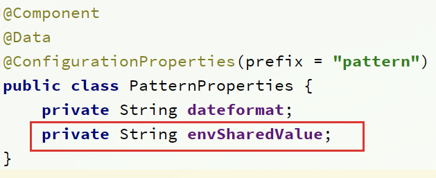 package cn.itcast.user.config;import lombok.Data;import org.springframework.boot.context.properties.ConfigurationProperties;import org.springframework.stereotype.Component;@Component@Data@ConfigurationProperties(prefix = "pattern")public class PatternProperties {private String dateformat;}
