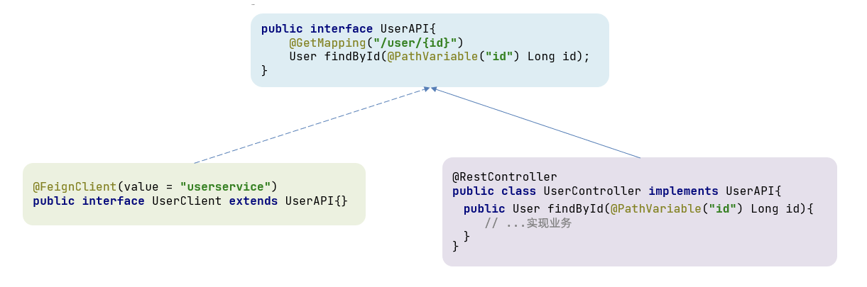 package cn.itcast.order.client;import cn.itcast.order.pojo.User;import org.springframework.cloud.openfeign.FeignClient;import org.springframework.web.bind.annotation.GetMapping;import org.springframework.web.bind.annotation.PathVariable;@FeignClient("userservice")public interface UserClient {@GetMapping("/user/{id}")User findById(@PathVariable("id") Long id);}