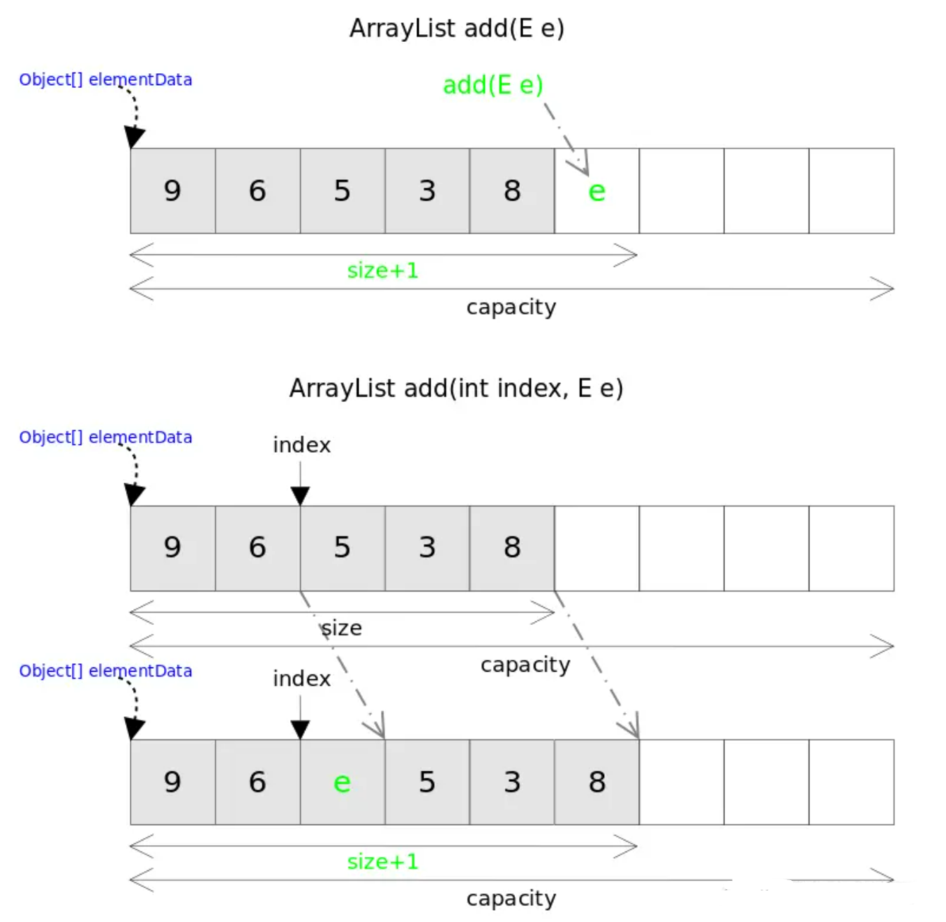 跟C++的vector不同,ArrayList没有push_back()方法,对应的方法是add(E e),ArrayList也没有insert()方法,对应的方法是add(int index, E e)。这两个方法都是向容器中添加新元素,这可能会导致capacity不足,因此在添加元素之前,都需要进行剩余空间检查,如果需要则自动扩容。扩容操作最终是通过grow()方法完成的。