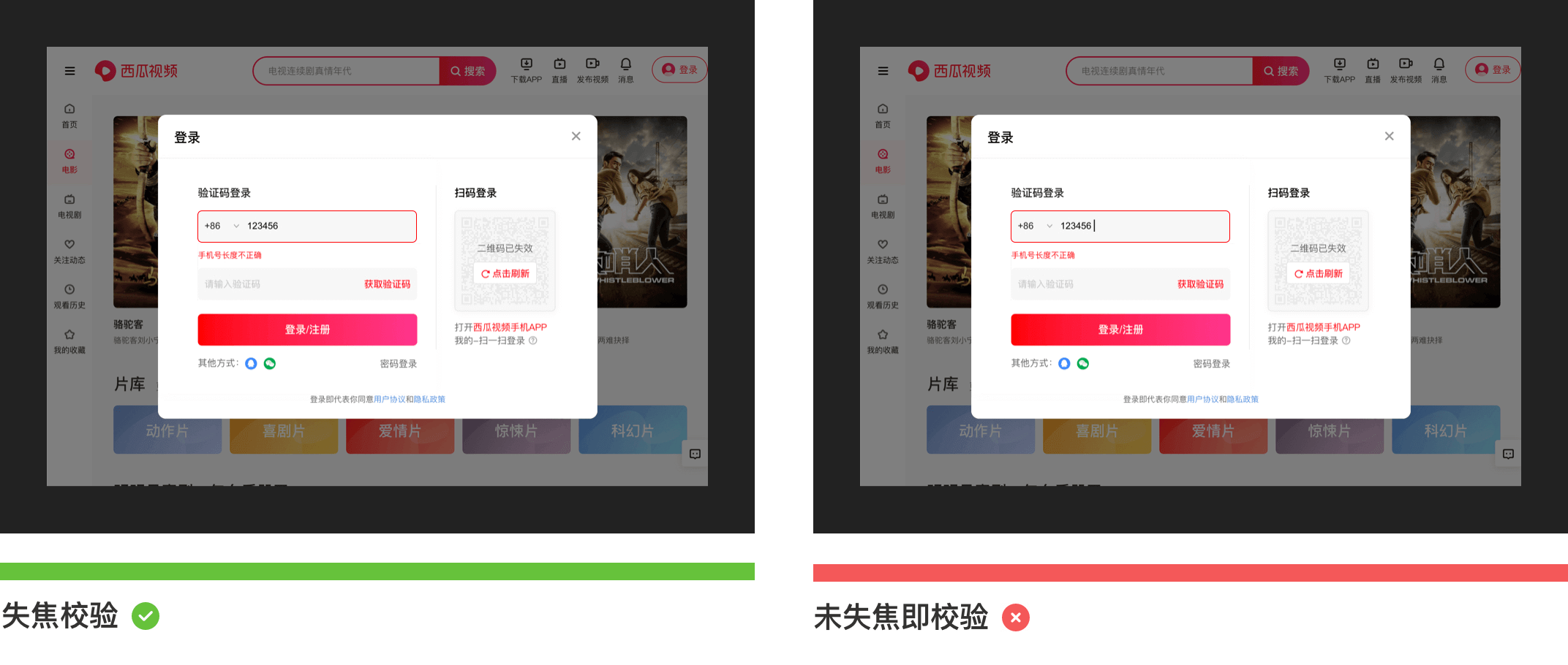 错误校验提示一般存在于错误率较高情况下出现,如:在登录注册时,要求用户填写手机号,如果用户输入的手机号码不符合特定的输入格式,那么这时候需要明确标记错误原因,准确的帮助用户找到问题并解决,避免错误提示描述模糊不清误导用户。错误提示一般会采用“双重视觉强调”来显示错误,除了输入框突出显示外,同时需要在输入框下方加入红色指导文字。如下图所示为西瓜视频登录注册场景下的截图: