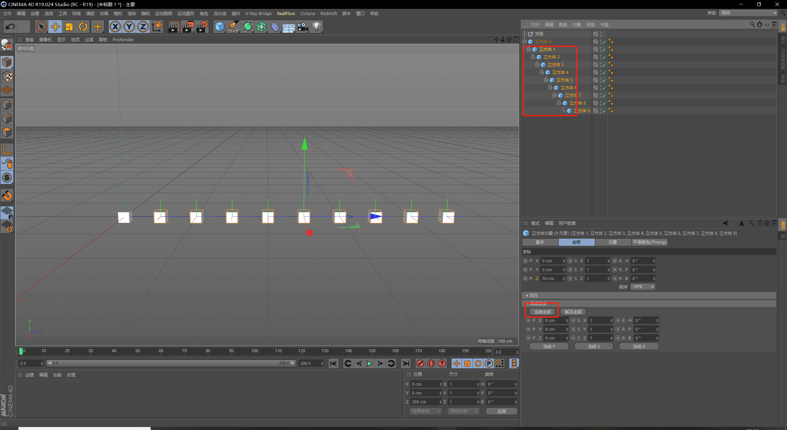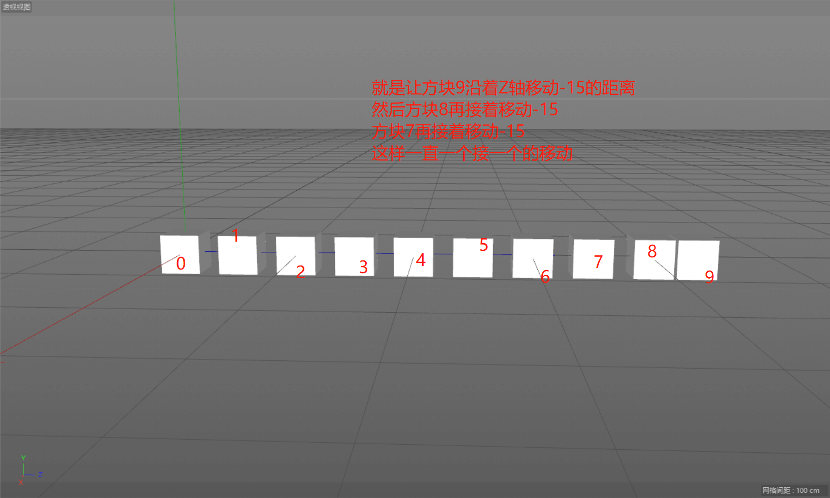 例如让上图10个模型依次沿Z轴移动-15,并让各自的关键帧错位10帧