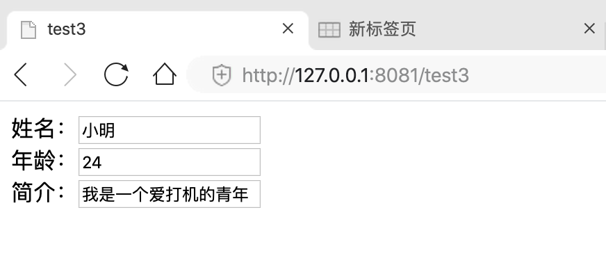 # 接着在resources 里面的 templates文件下新建 test3.html页面# 用来接收赋值# 代码如下:<!DOCTYPE html><html><head><meta charset="UTF-8"><title>test3</title></head><body>姓名:<input type="text" th:value="${name}"><br/>年龄:<input type="text" th:value="${age}"><br/>简介:<input type="text" th:value="${info}"><br/></body></html>