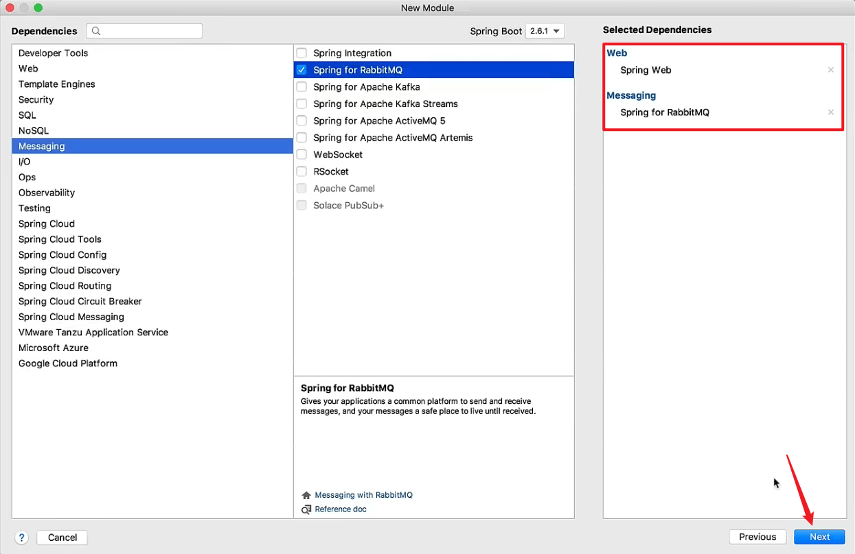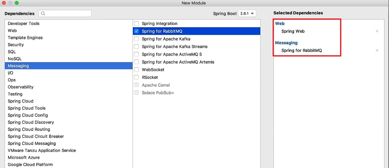 然后以同样的方法在mq_demo04工程中创建一个消息的消费者的模块,模块名叫做consumer,勾选的依赖同上