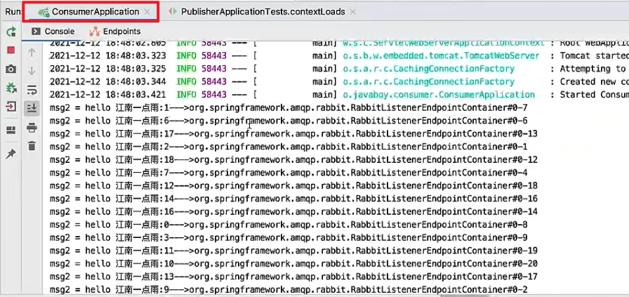 @SpringBootTestclass PublisherApplicationTests {@AutowiredRabbitTemplate rabbitTemplate;@Testvoid contextLoads() {for (int i = 0; i < 20; i++) {rabbitTemplate.convertAndSend(RabbitConfig.QUEUE_NAME, "hello 江南一点雨:" + i);}}}