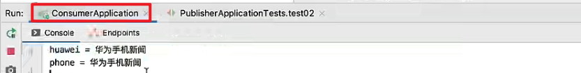 先运行consumer模块的应用,然后再运行publisher模块的单元测试方法contextLoads(),最后可以看到consumer模块的控制台收到了publisher模块发布的消息。