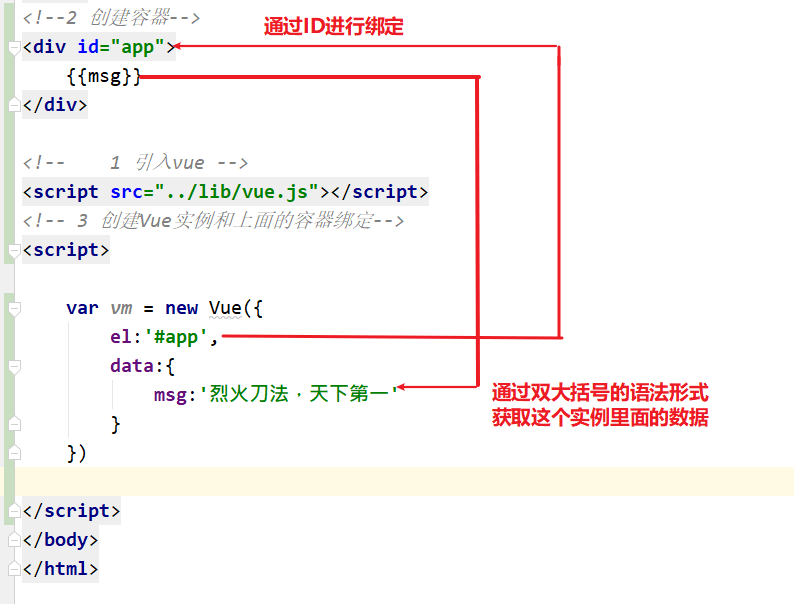 <!DOCTYPE html><html lang="en"><head><meta charset="UTF-8"><title>Title</title></head><body><!--2 创建容器--><div id="app">{{msg}}</div><!-- 1 引入vue --><script src="../lib/vue.js"></script><!-- 3 创建Vue实例和上面的容器绑定--><script>var vm = new Vue({el:'#app',data:{msg:'烈火刀法,天下第一'}})</script></body></html>