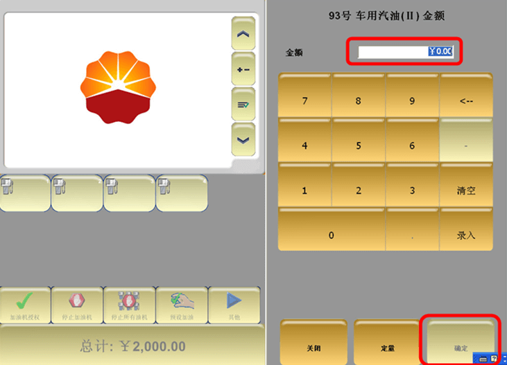 ❸ 输入本次交易的金额,然后点击“确定”按钮,或者点击下方的“定量”按钮,输入本次交易中加油的升数,然后点击“确定”按钮,如下图: