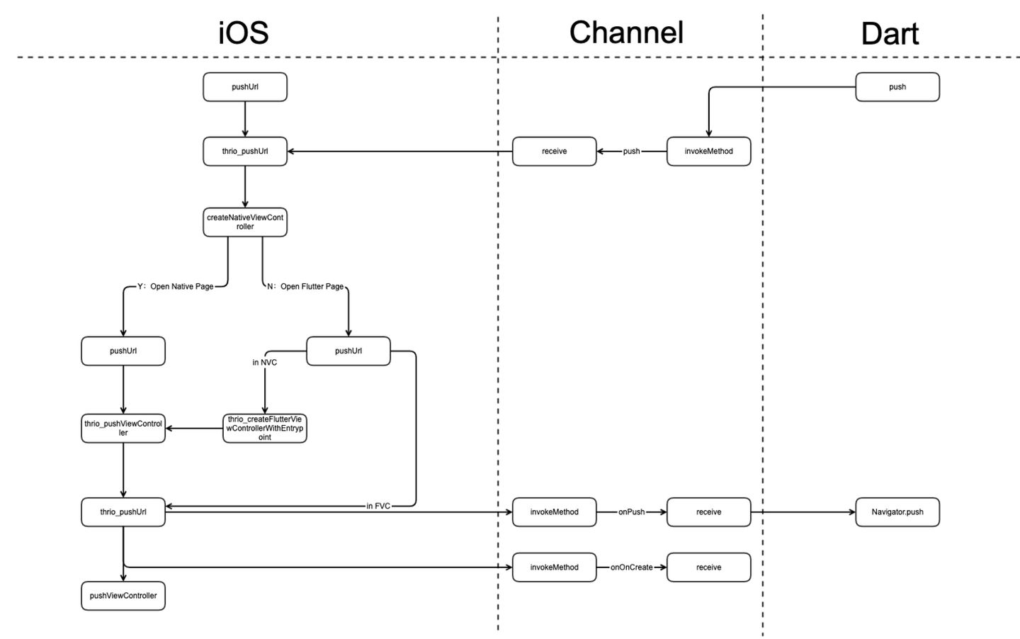可见,在这种场景下,Thrio 还是做出了一定的优化的。但与之带来的,就是实现的复杂性。我们谈到 Flutter Boost 的优点是简单,路由全部收归原生导航栈。而 Flutter Thrio 混用了原生导航栈和 Flutter Navigator,因此实现会相对更复杂一下。这里我梳理了一下 Flutter Thrio open 时关键函数路径,可以看到,Thrio 的导航管理确实是复杂了一些。