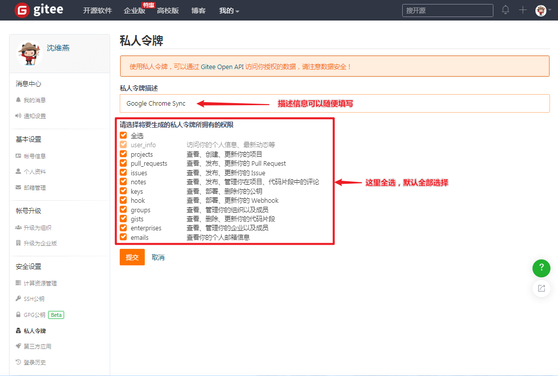 点击生成令牌之后,在页面中填写 私人令牌描述,下面权限要全选: