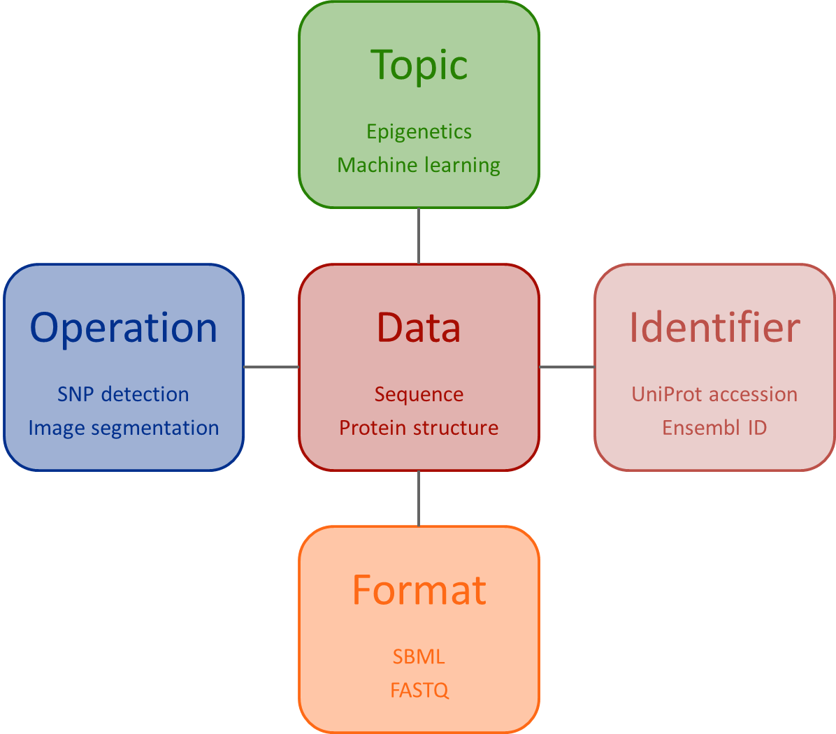 Everything from simple command-line tools and online services, through to databases and complex, multi-functional analysis workflows is included. Resources are described in a rigorous semantics and syntax, providing end-users with the convenience of concise, consistent and therefore comparable information.