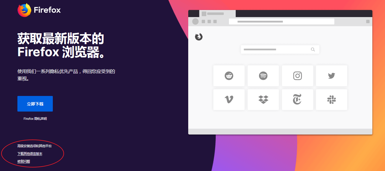 我们需要从Firefox下载页的高级安装选项与其他平台链接下载 Windows 平台的完整离线 Firefox 安装程序(Firefox Setup