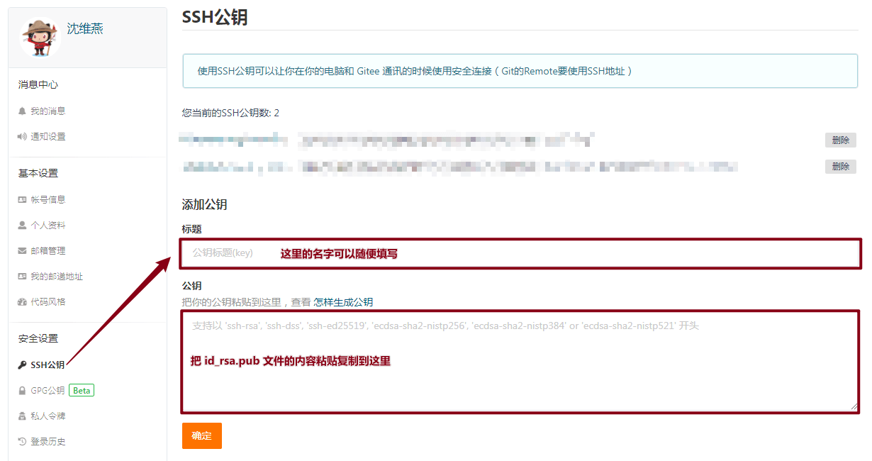 第四,在 Gitee 的个人设置页面「安全设置 -> SSH 公钥」配置 SSH 公钥(即:id_rsa.pub),命名随意。