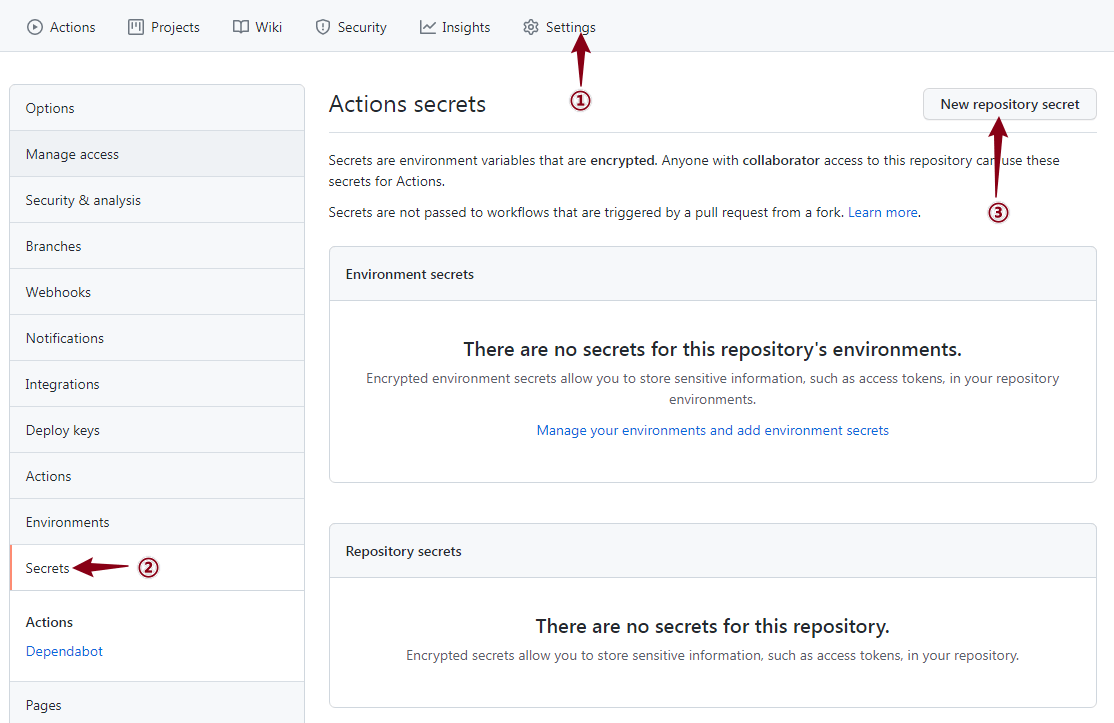 第二,在 GitHub 项目的「Settings -> Secrets → New repository secret」路径下配置好命名为 GITEE_RSA_PRIVATE_KEY 和 GITEE_PASSWORD 的两个密钥。其中: