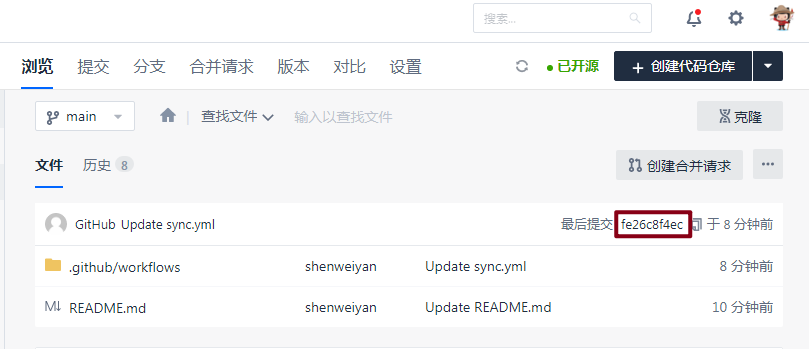 最后,修改代码(如修改 README),提交,成功触发同步!