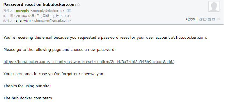 等待了 1 到 2 天,终于收到 Docker Hub 的答复,根据链接,重置密码成功!