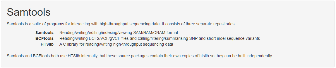 Htslib 系列的软件主要包括:Samtools、BCFtools、HTSlib,其中 HTSlib 是前两个都需要用到的 C 语言依赖库。