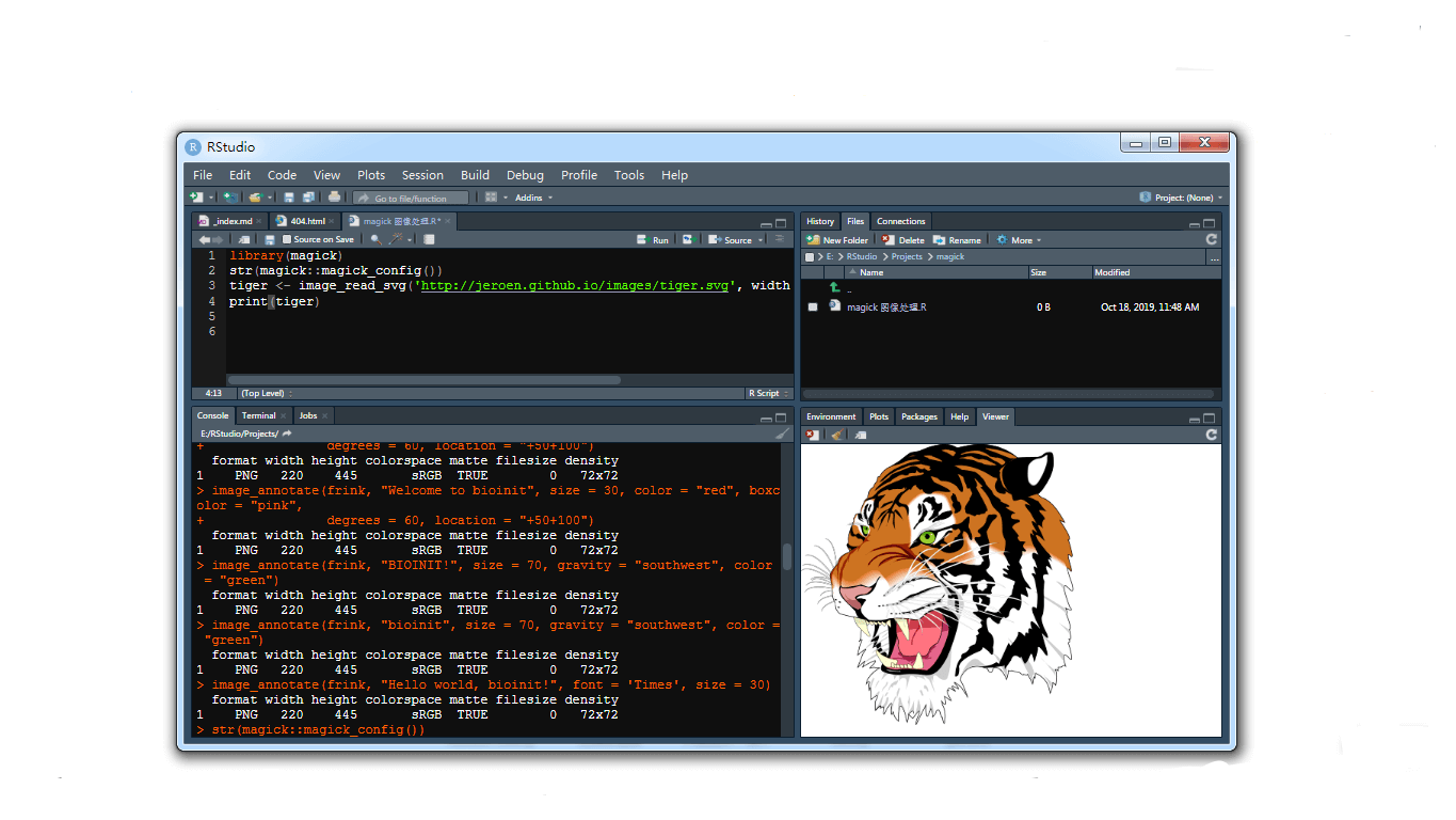 具有内置网络浏览器(例如 RStudio)的 IDE 会在查看器中自动显示魔术图像。这就形成了一个整洁的交互式图像编辑环境。