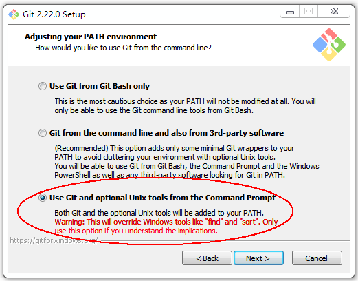 首先,安装 Git for Windows,安装过程中注意勾选 “Use Git and optional Unix tools from the Command Prompt“。
