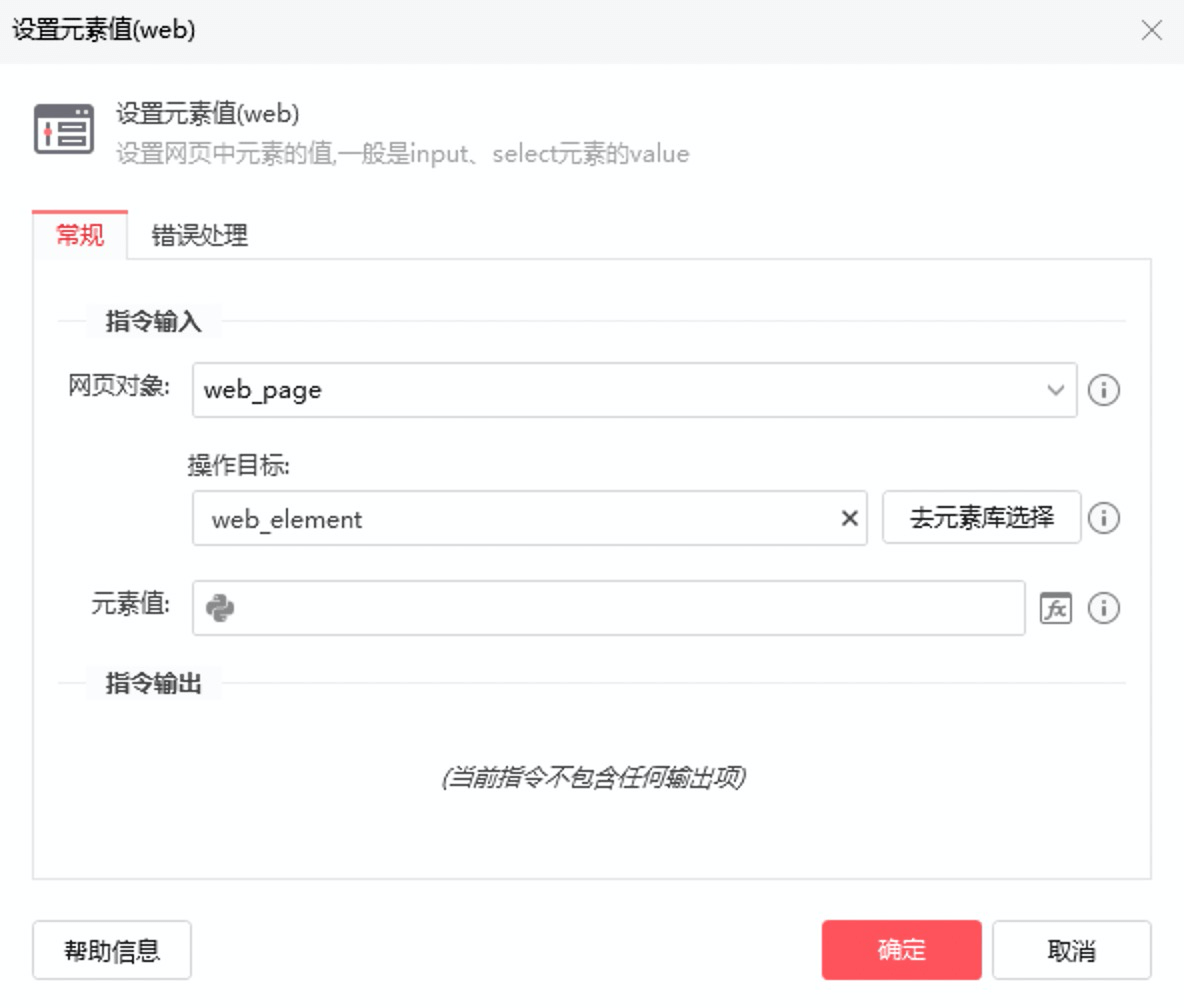 描述:设置网页元素值,一般是input、selectUAN素的value_配置项说明:网页对象选择一个之前通过【打开网页】或【获取已打开的网页对象】指令创建的网页对象。** 操作目标 从元素库选择目标网页元素; 如元素库还没有该元素,可通过【捕获新元素】或【深度模式捕获新元素】来捕获元素。 元素值input、select等元素的value。 使用示例此流程执行逻辑:打开百度 —>将输入框的值设为”WinRobot”。