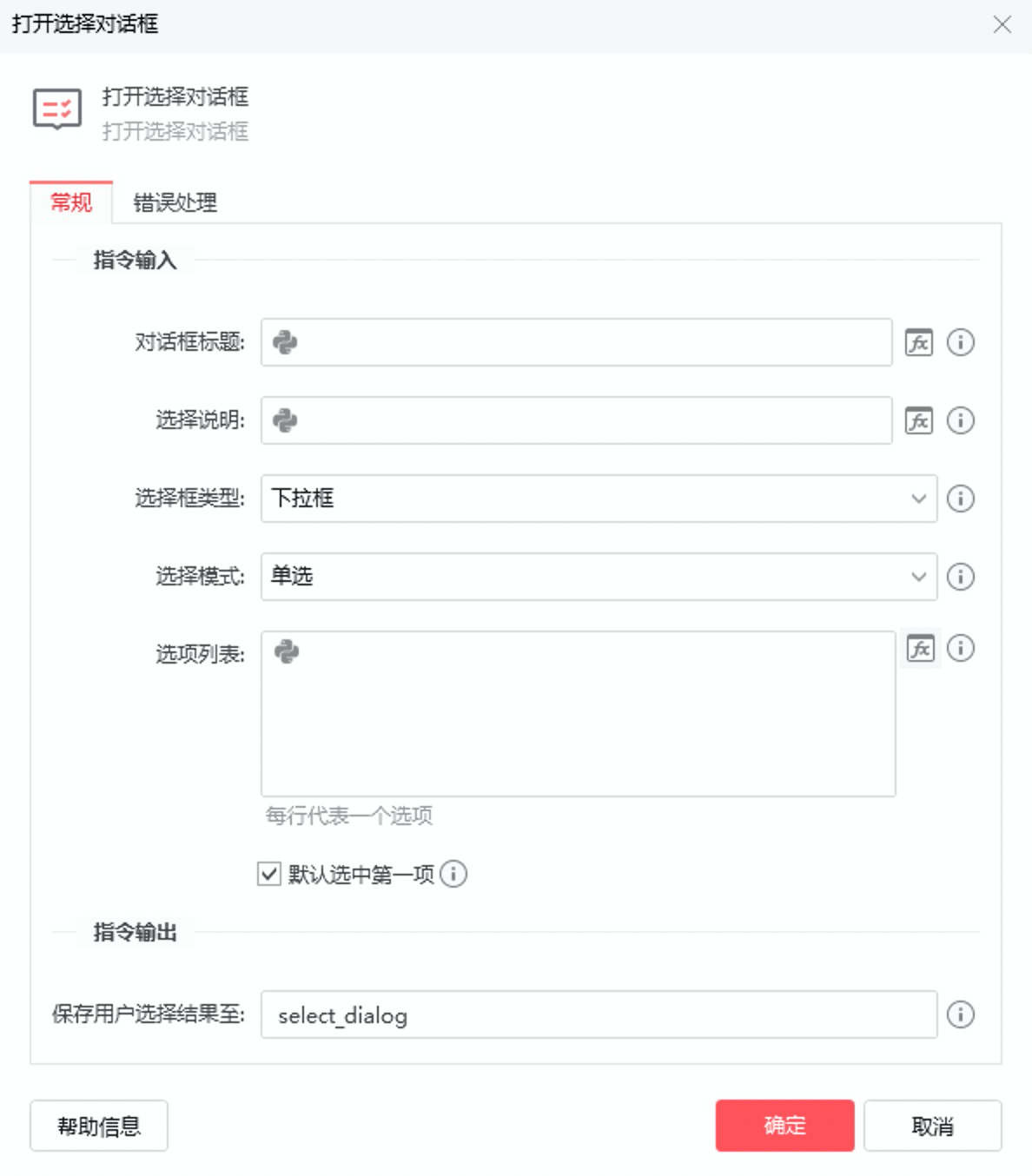 描述打开选择对话框 配置项说明对话框标题选择对话框的标题 选择说明选择说明 选择框类型 下拉框列表 选择模式 单选多选 选项列表 非python模式下输入,一行代表一下选项python模式下输入,写成列表形式,列表的项即为选项 保存用户选择结果至 将选择对话框的选项结果保存给一个变量 使用示例:此流程执行逻辑:打开选择对话框(人工选择选项) —> 打印对话框选择的结果。