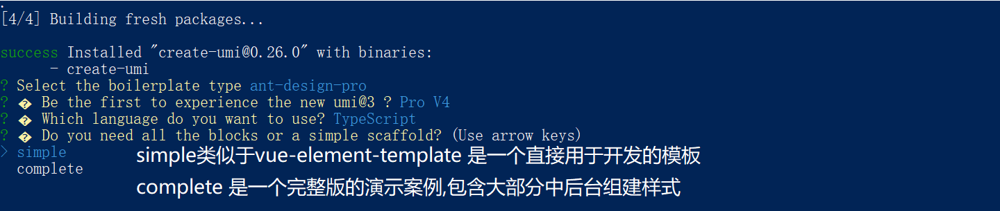 开发阶段选择 simple 版本安装,该模板只包含基本的ant-design-pro后台布局,方便在此基础上进行二次开发.