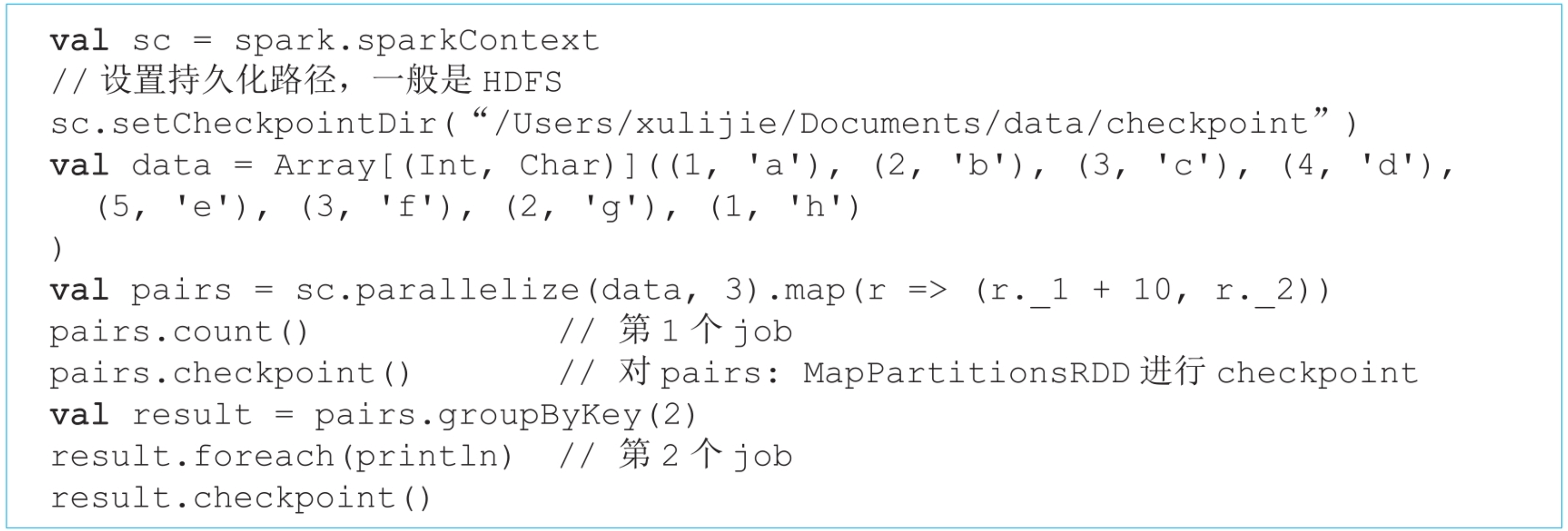 在Spark中,提供了sparkConext.setCheckpointDir(directory)接口来设置checkpoint的存储路径。同时,提供rdd.checkpoint()来实现checkpoint。