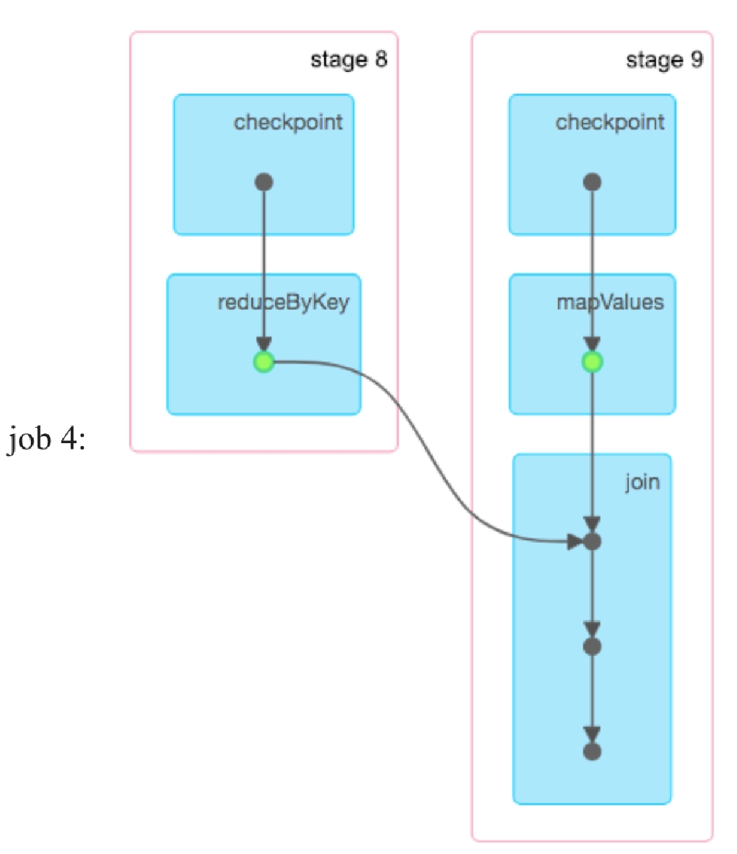 对比job 4和图8.22中的job 2可以发现:checkpoint切断了lineage,使得job 4不需要再保存整个应用的数据依赖图。checkpoint可以这样做的原因是RDD被持久化到了可靠的分布式文件系统上,该RDD不需要通过再次计算得到,也就没有必要保存其lineage了。这一点对于迭代型应用很重要,迭代型应用的lineage会很长,及时进行checkpoint可以减少job复杂程度,降低再次运行时的计算开销。如果单纯是为了降低job lineage的复杂程度而不是为了持久化,Spark还提供了localCheckpoint()方法,功能上等价于“数据缓存”加上“checkpoint切断lineage”的功能。