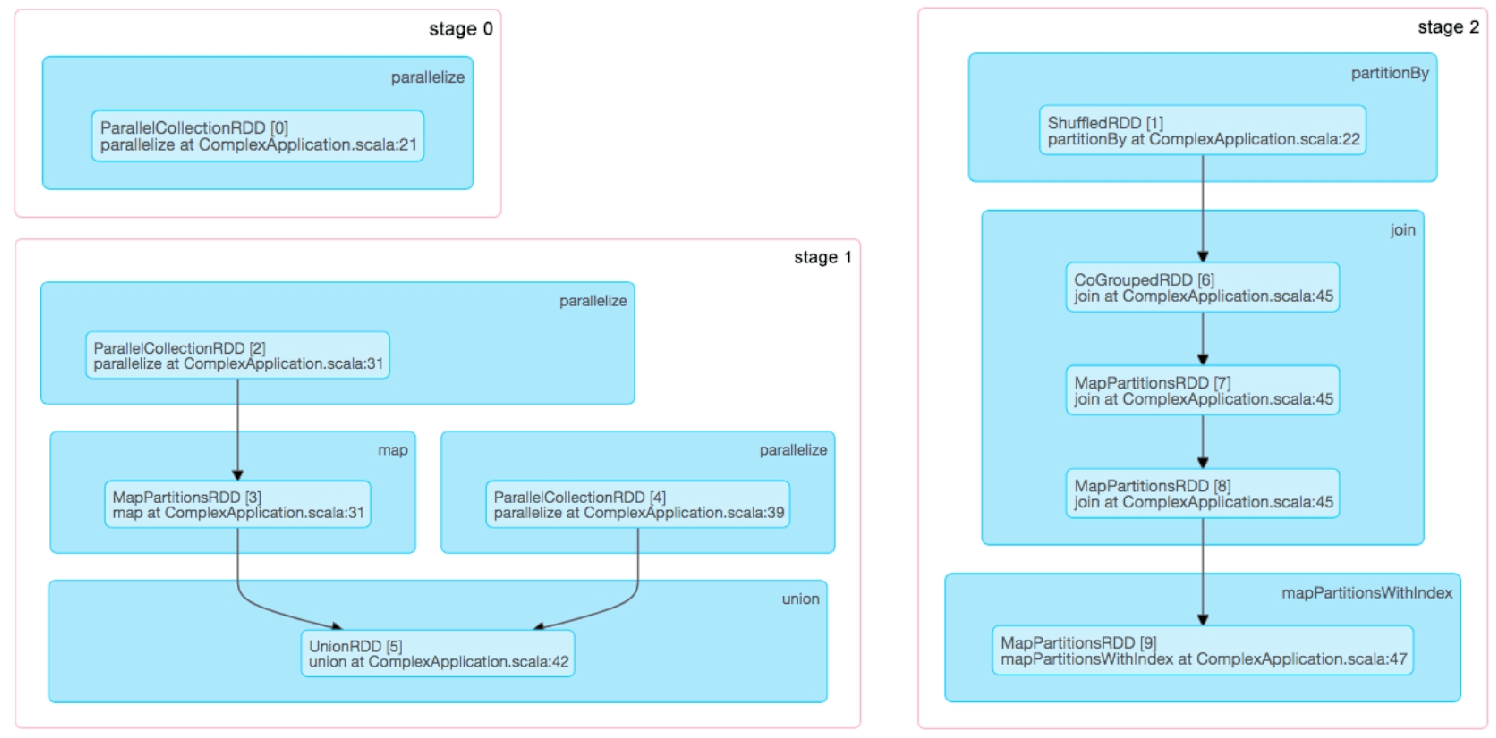 图4.7 ComplexApplication应用中每个stage包含的操作及生成的RDD信息