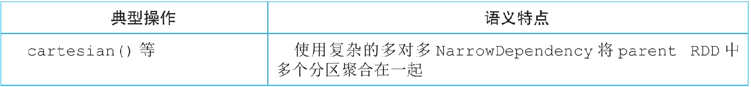 如图4.16所示,cartesian()操作对应的数据依赖关系是ManyToManyDependency,child RDD中的每个分区需要从两个parent RDD中获取所依赖的分区的全部数据。虽然ManyToManyDependency形似ShuffleDependency,却属于NarrowDependency,因此Spark将parent RDD和child RDD组合为一个stage,该stage生成的task个数与最后的RDD的分区个数相等。与ManyToOneDependency形成的task相比,这里每个task需要同时在多个parent RDD中获取分区中的数据。